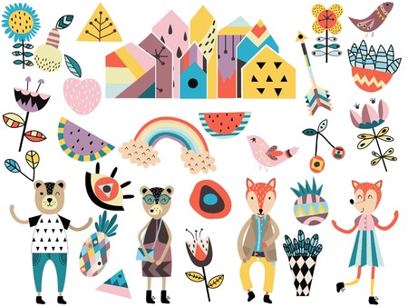 かわいい北欧スタイルの要素と動物のセットです 手には ベクター グラフィックが描画されます のイラスト素材 ベクタ Image